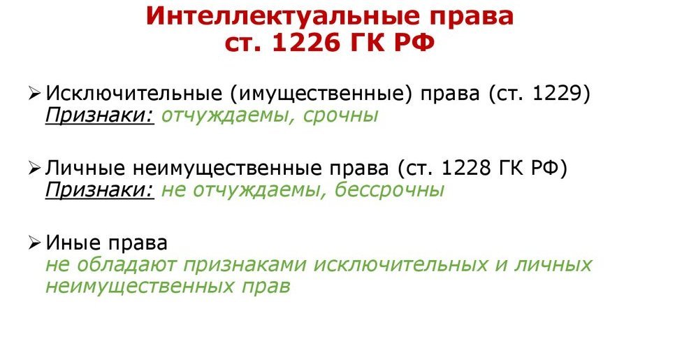 Интеллектуальные права делятся на три вида (ст. 1226 ГК РФ):
