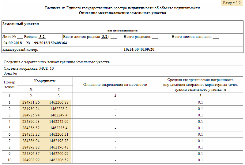 Обратите внимание, точки в выписке указываются в местной системе координат — это не GPS. Чтобы соотнести их с фактической картой, используйте наш геодезический калькулятор.