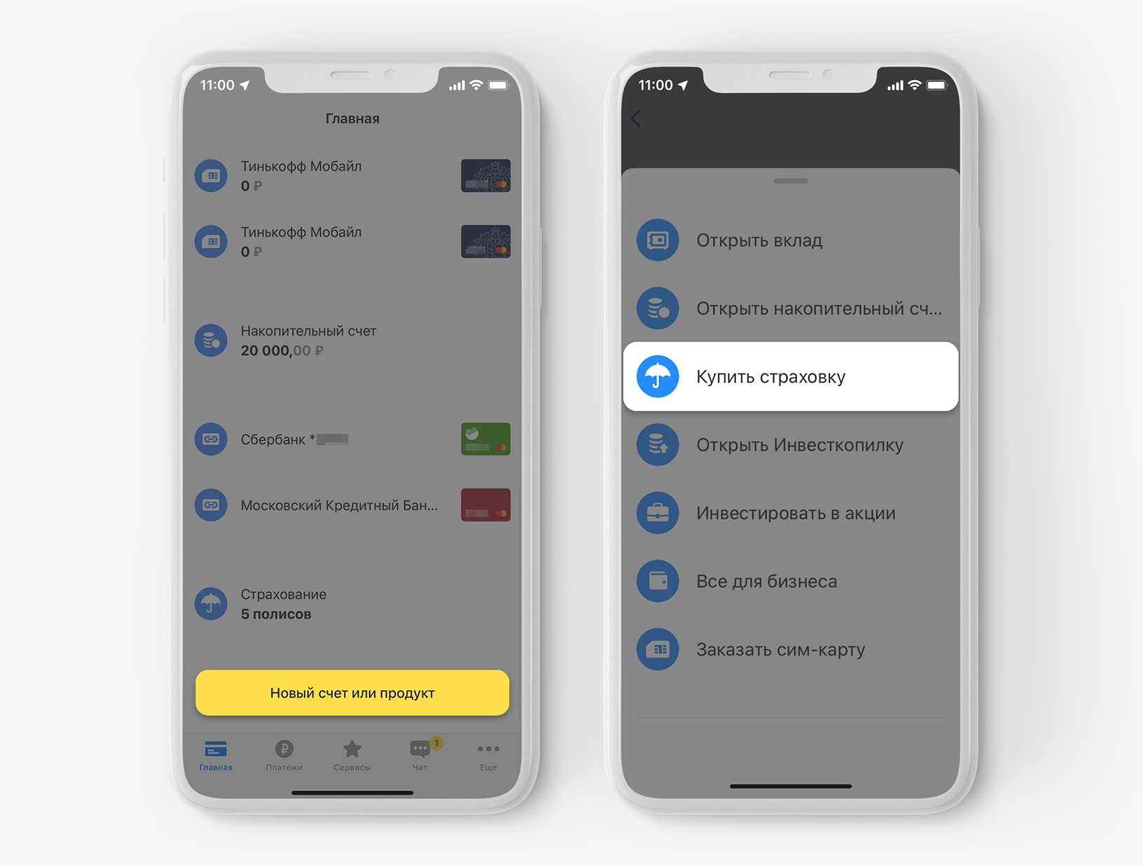 Также внести данные, чтобы узнать цену полиса, можно в приложении Тинькофф. Для этого прокрутите главный экран в самый низ и нажмите на кнопку «Новый счет или продукт» → «Купить страховку» → «ОСАГО». Скачать приложение Тинькофф