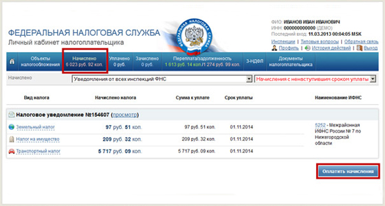 Посмотреть все налоговые начисления можно на соответствующей вкладке. Чтобы оплатить конкретный налог, нужно нажать на кнопку «Оплатить начисления». Программа предложит вам два варианта: сформировать квитанцию для оплаты в банке или перечислить деньги онлайн, не выходя из кабинета. Проверить, поступили деньги на лицевой счет или нет, можно примерно дней через десять.