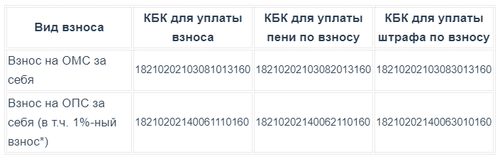 - 182 1 02 02140 06 1110 160 — страховые взносы в ПФР (и фиксированные 23 400 рублей за 2017 год, и дополнительные +1% с дохода выше 300 000 рублей),