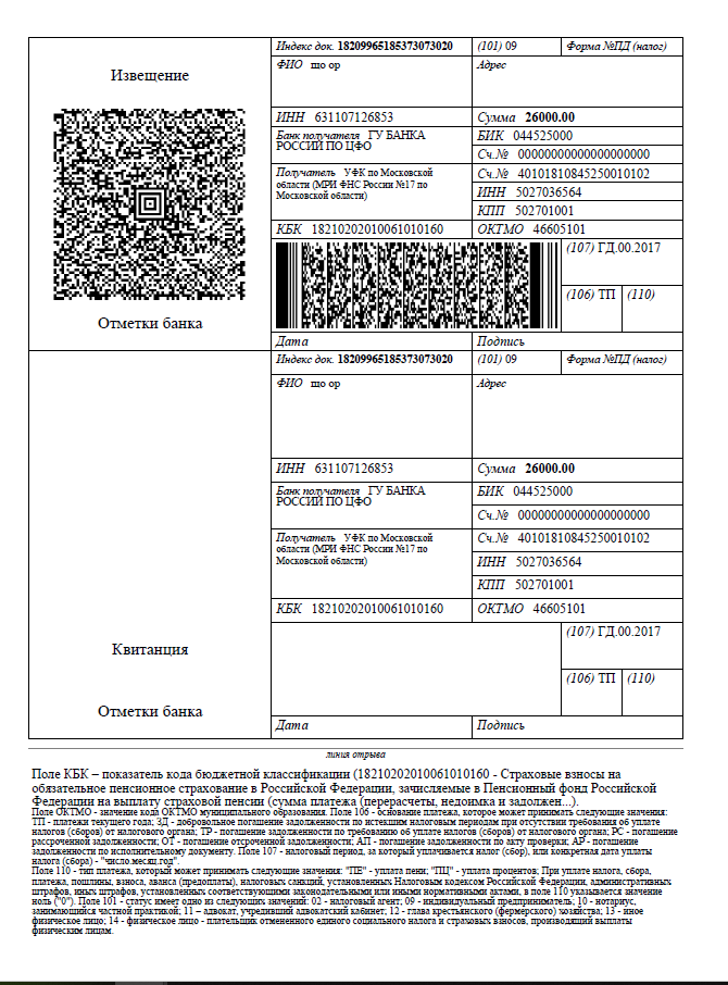 Обратите внимание! Уплата пенсионных взносов в размере 1% с доходов свыше 300 тыс.рублей производится по тому же КБК, что указан выше в квитанции. Отдельного КБК для 1-% платежей с 2017 года нет.