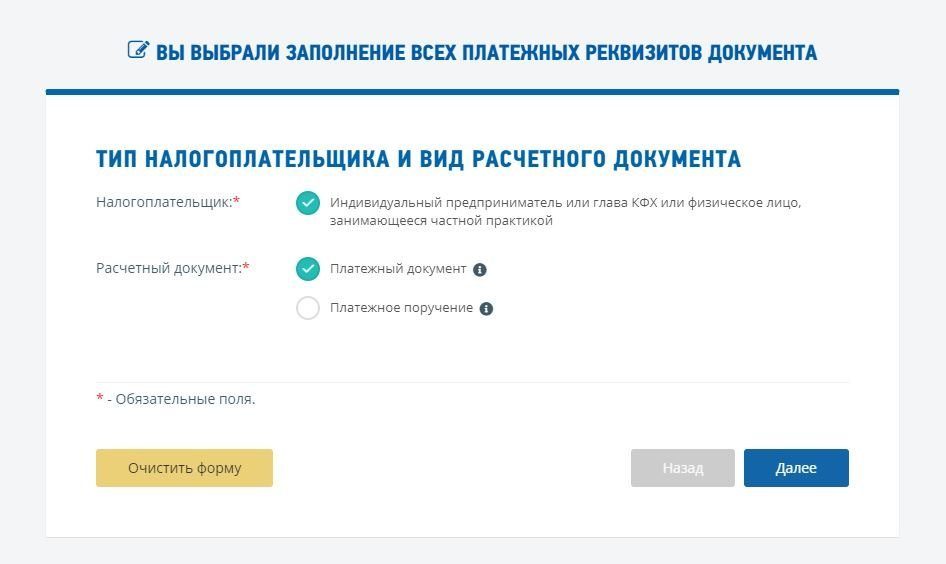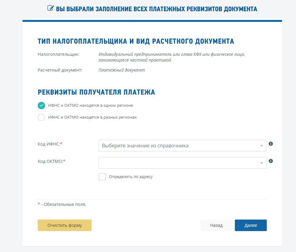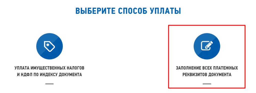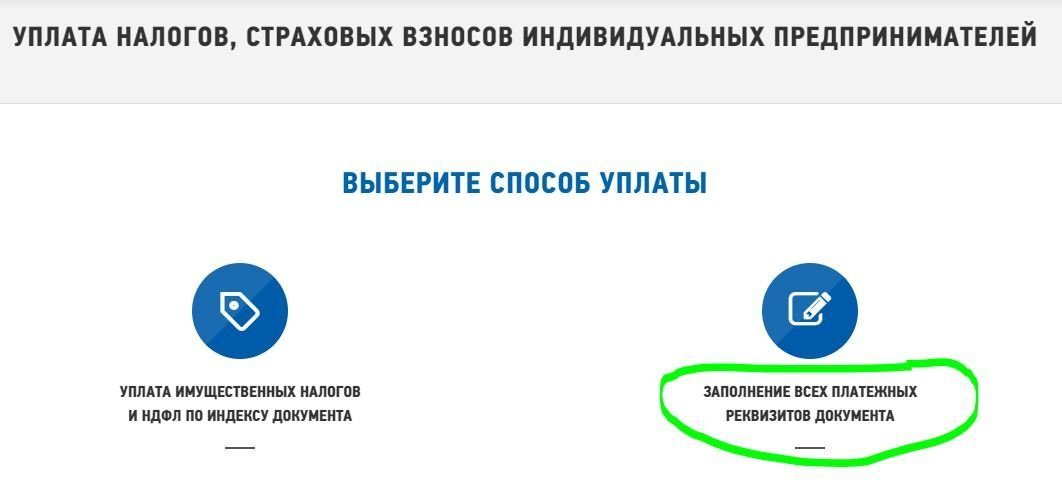 Далее, если у вас уже есть квитанция, то вы можете ввести ее индекс и оплатить страховые взносы ИП на сайте налоговой. Мы же рассматриваем вариант, когда мы сами формируем квитанцию, поэтому выбираем «Заполнение всех платежных реквизитов документа»