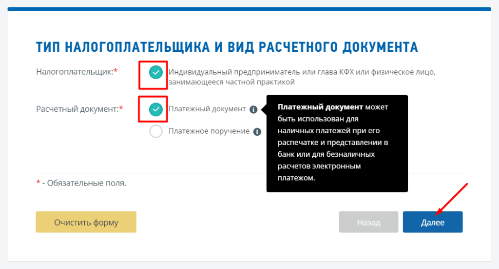 После этого выбираем вид расчетного документа — ставим галочку «Платежный документ», нажимаем Далее.