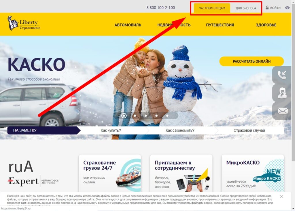 Открыть официальный сайт компании www.liberty24.ru и выбрать необходимую категорию полисов – частным лицам или бизнесменам.